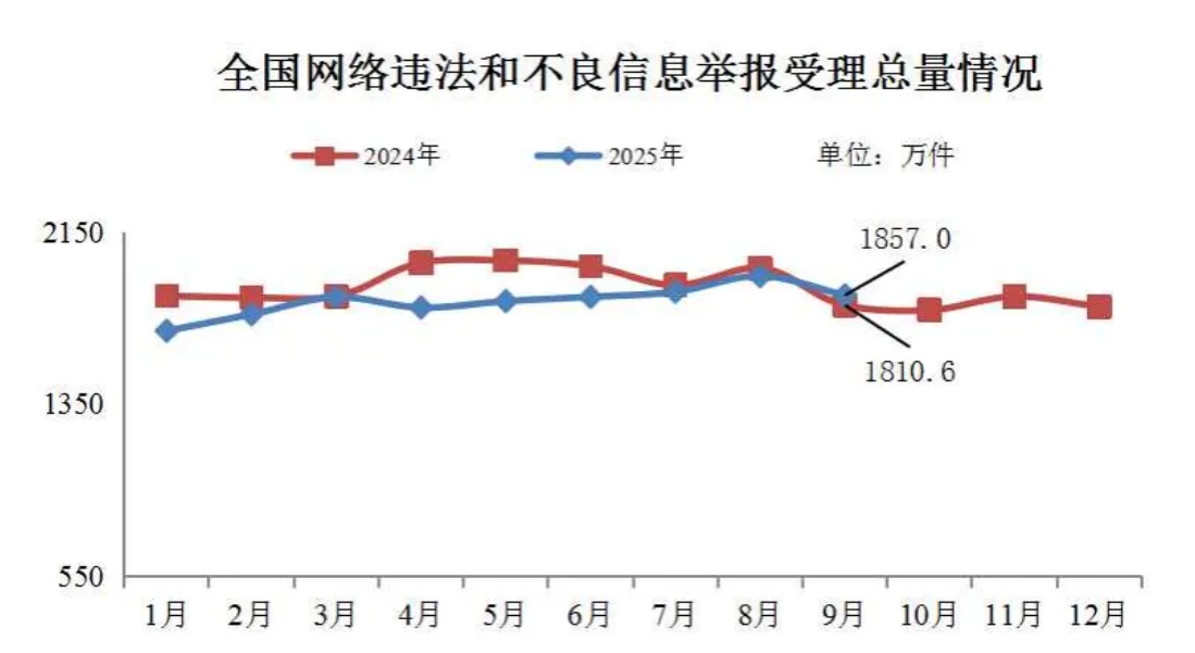 2025年9月,中央网信办举报中心指导全国各级网信举报工作部门、主要网站平台受理网民举报色情、赌博、侵权、谣言等违法和不良信息1857万件,环比下降4.6%、同比增长2.6%。其中,中央网信办举报中心受理举报39.4万件,环比下降7.4%、同比下降1.6%;各地网信举报工作部门受理举报100.8万件,环比增长58.8%、同比下降9%;全国主要网站平台受理举报1716.8万件,环比下降6.7%,同比增长3.4%。