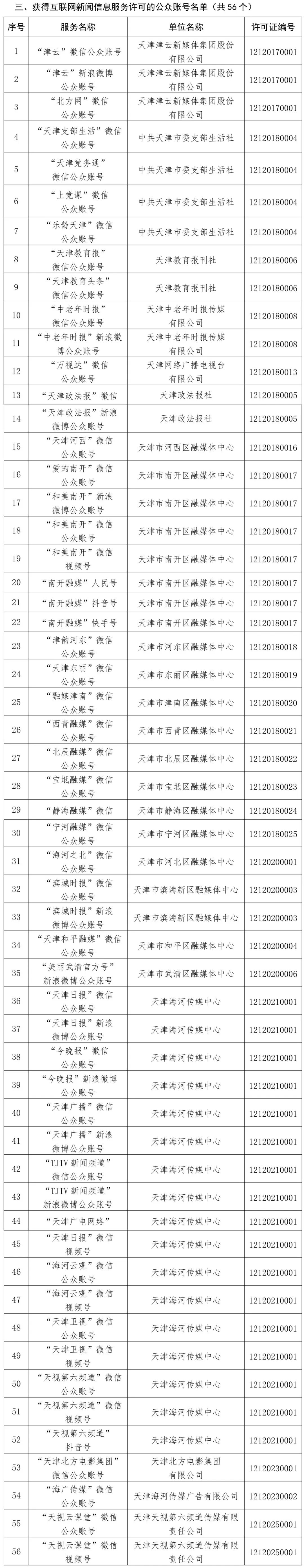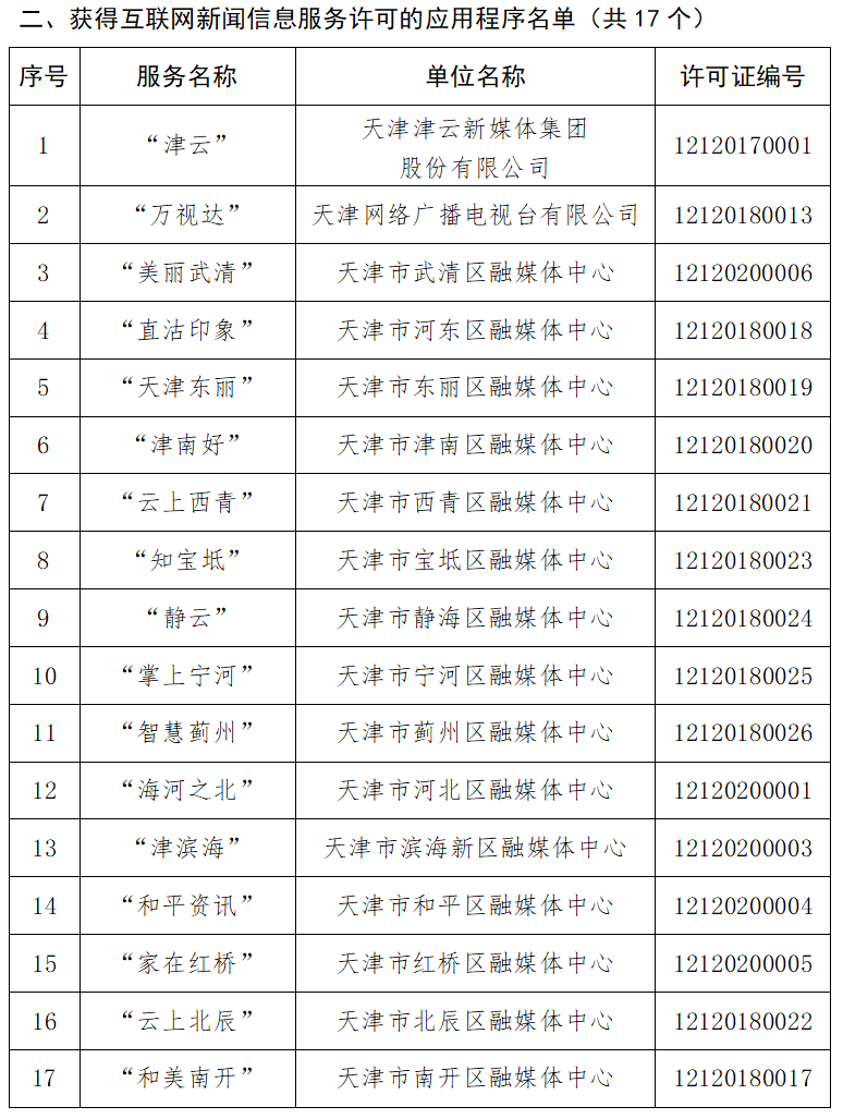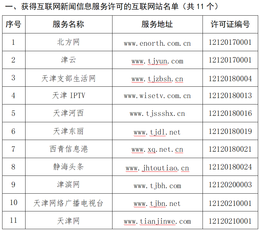 自《互联网新闻信息服务管理规定》颁布实施以来,天津市互联网信息办公室负责组织开展本市互联网新闻信息服务许可工作。现将天津市互联网新闻信息服务单位相关许可信息依法予以公开,包括:互联网站11个,应用程序17个,公众账号56个,共计84个服务项。