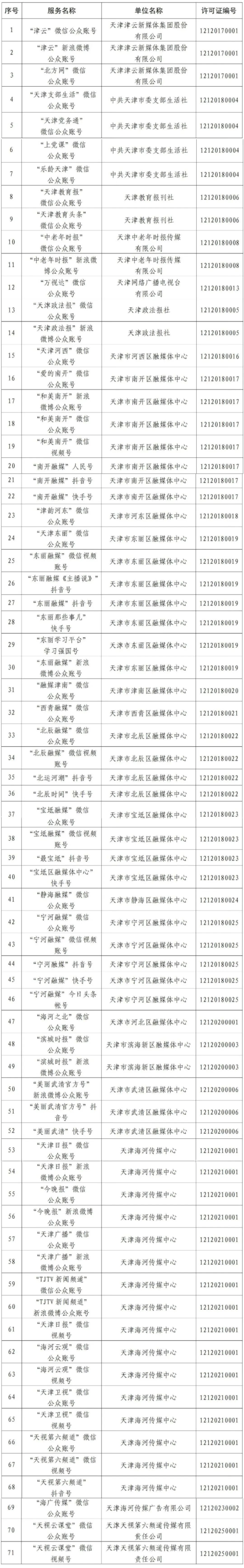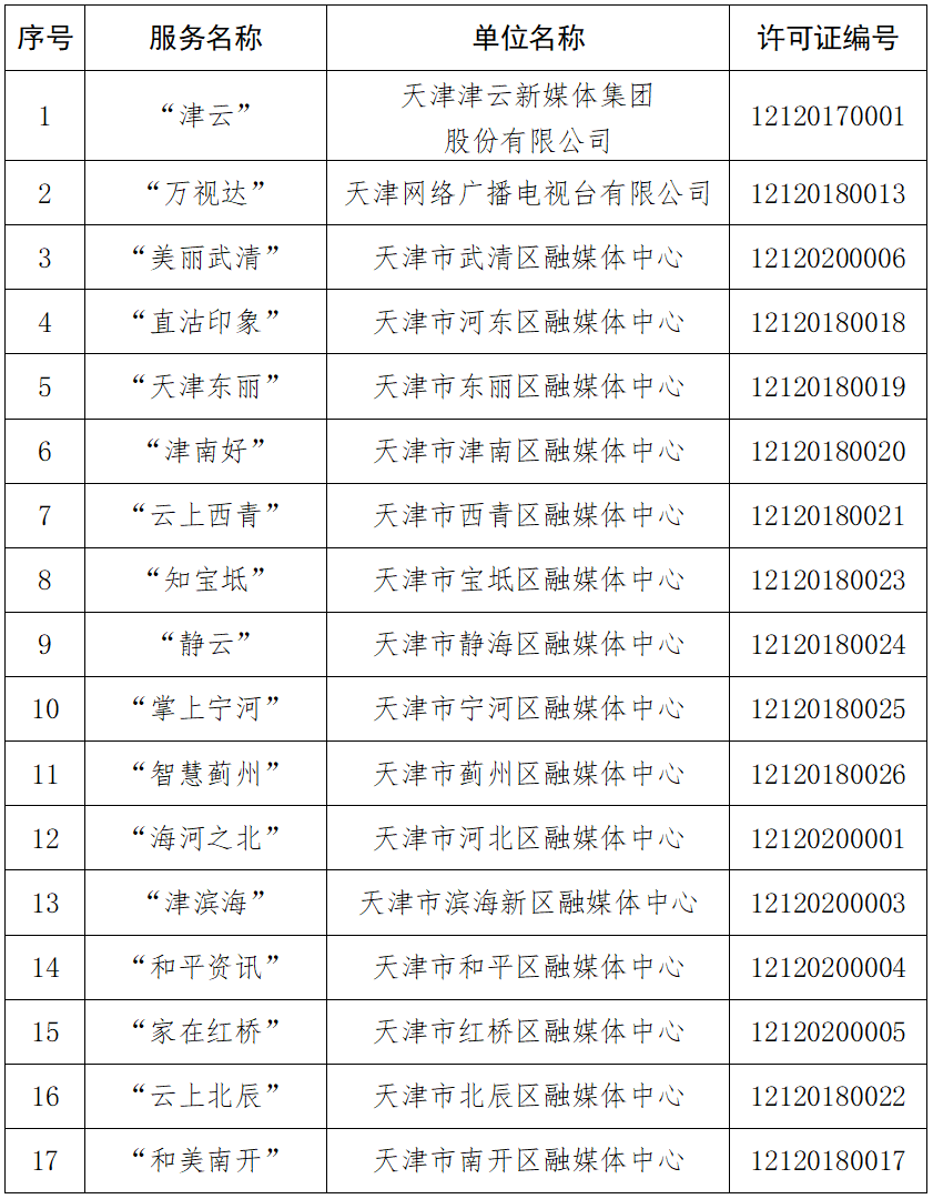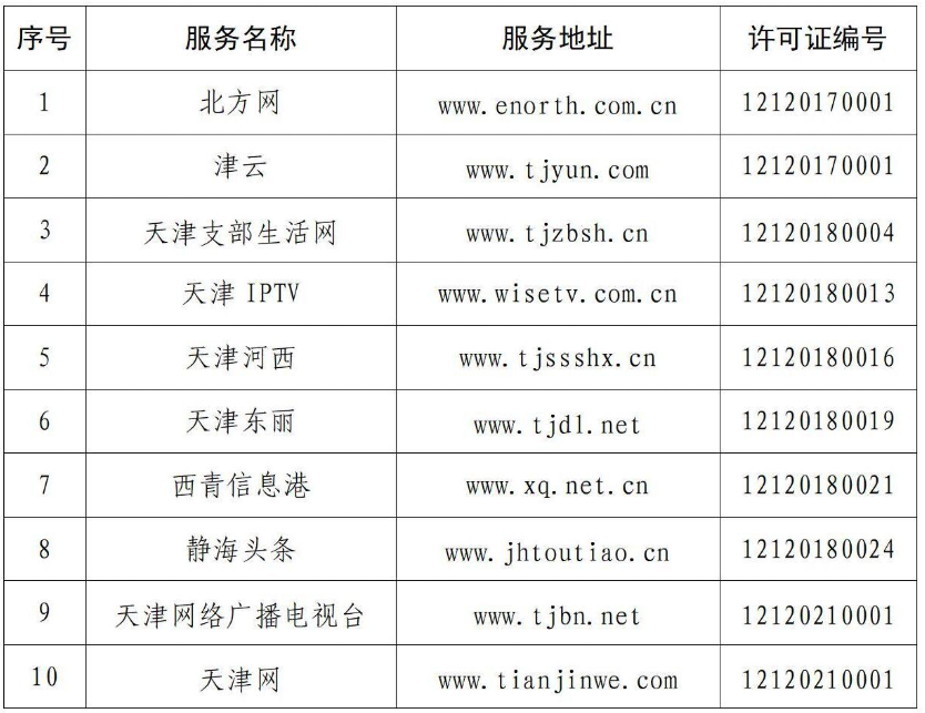 自《互联网新闻信息服务管理规定》颁布实施以来,天津市互联网信息办公室负责组织开展本市互联网新闻信息服务许可工作。现将天津市互联网新闻信息服务单位相关许可信息依法予以公开,包括:互联网站10个,应用程序17个,公众账号71个,共计98个服务项。