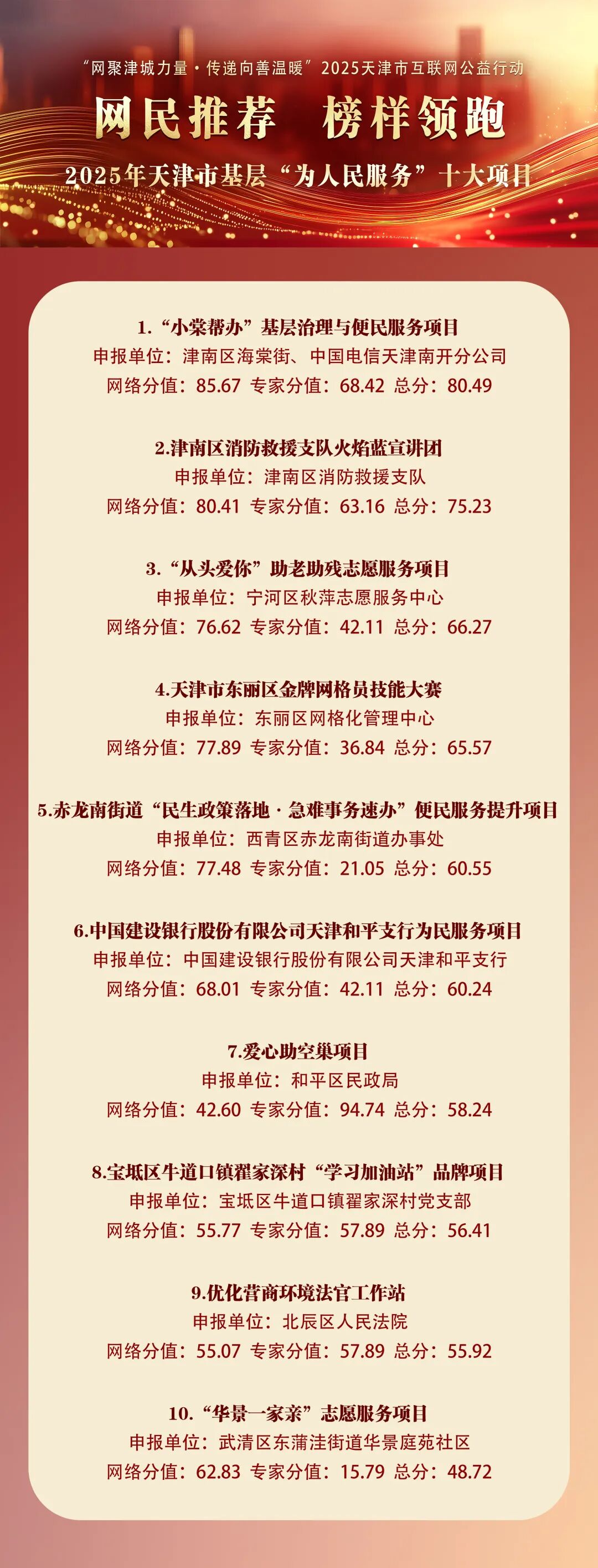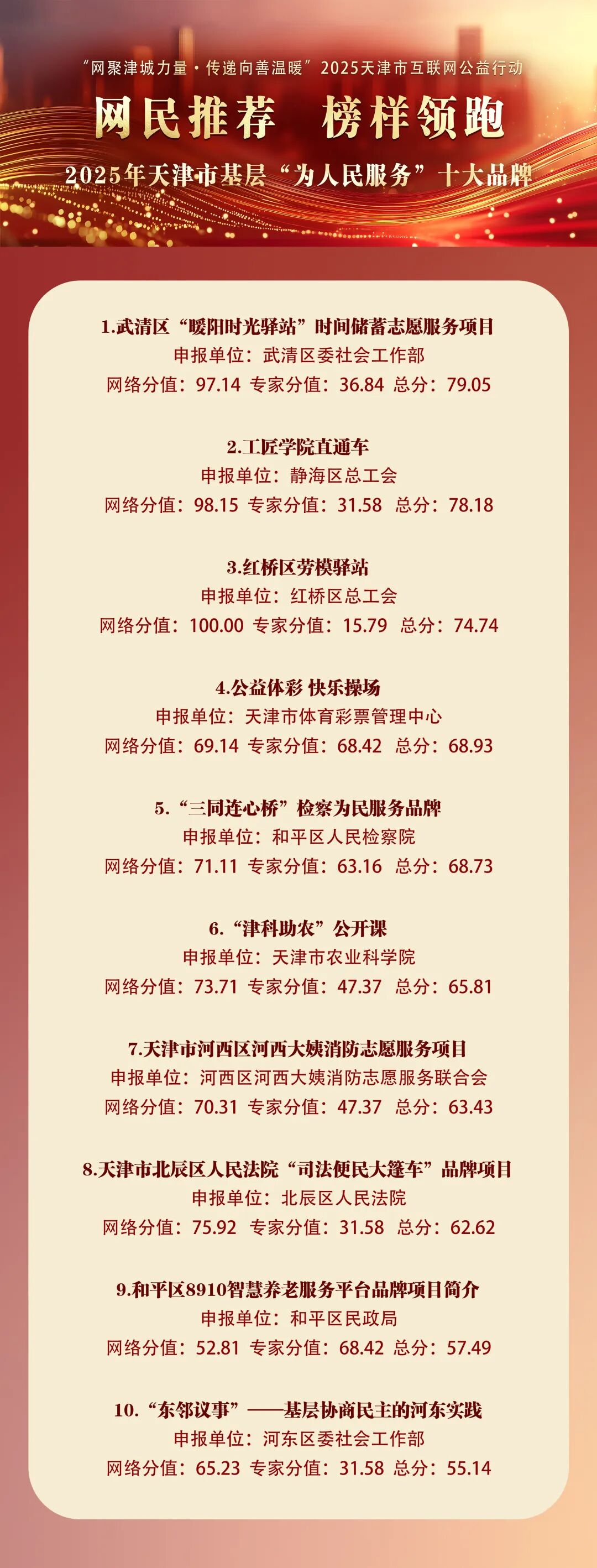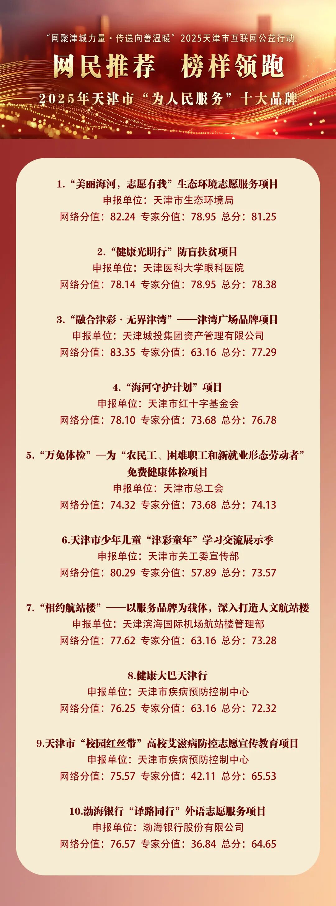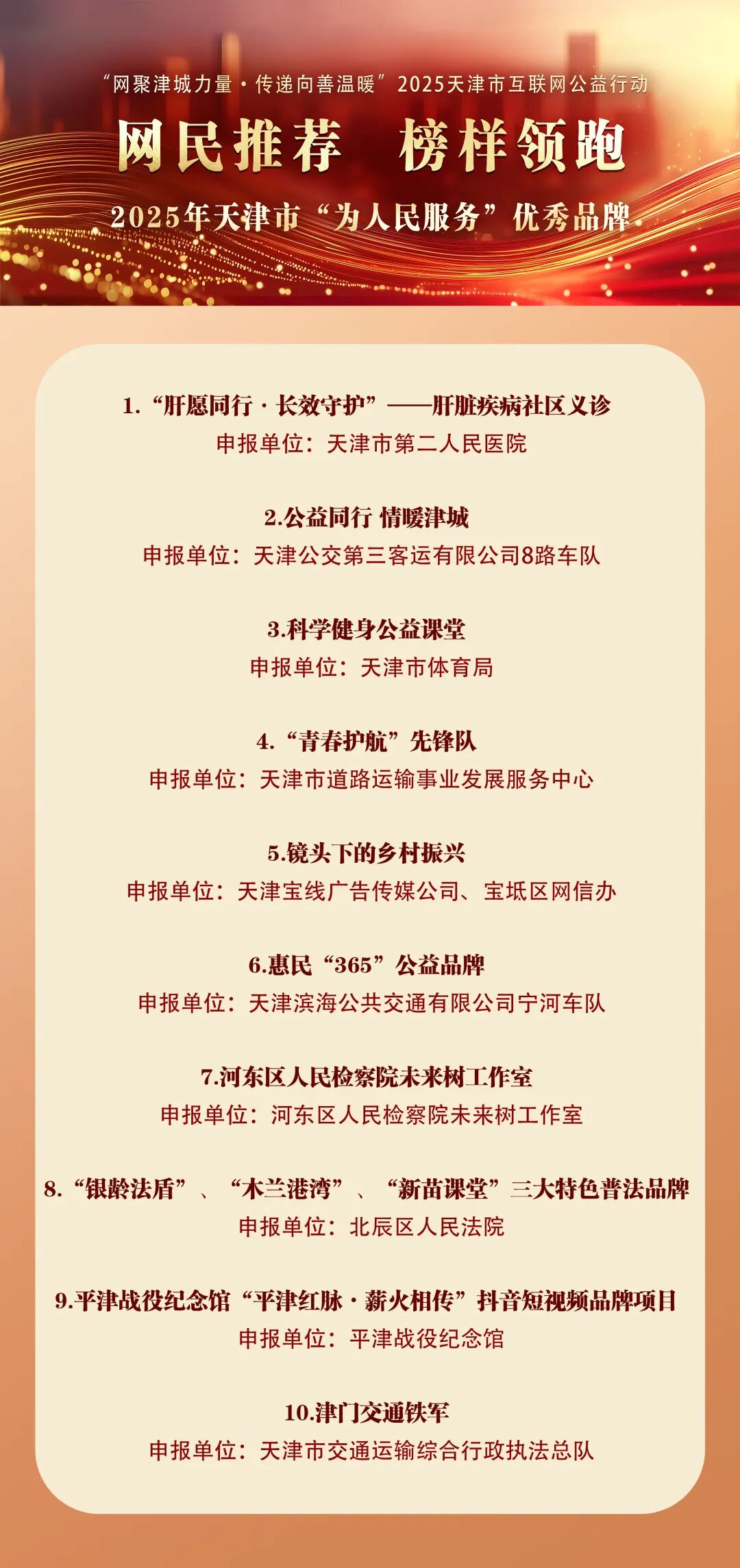 年终岁末,由2025天津市互联网公益行动组委会主办,海河传媒中心经济广播、惠民发布客户端承办的网民推荐:榜样领跑——2025年天津市“为人民服务”品牌项目、窗口单位公益宣传活动结果出炉。综合网民推荐和组委会专家评审推荐,最终推出重点宣传的2025年“为人民服务”品牌、项目和窗口单位。