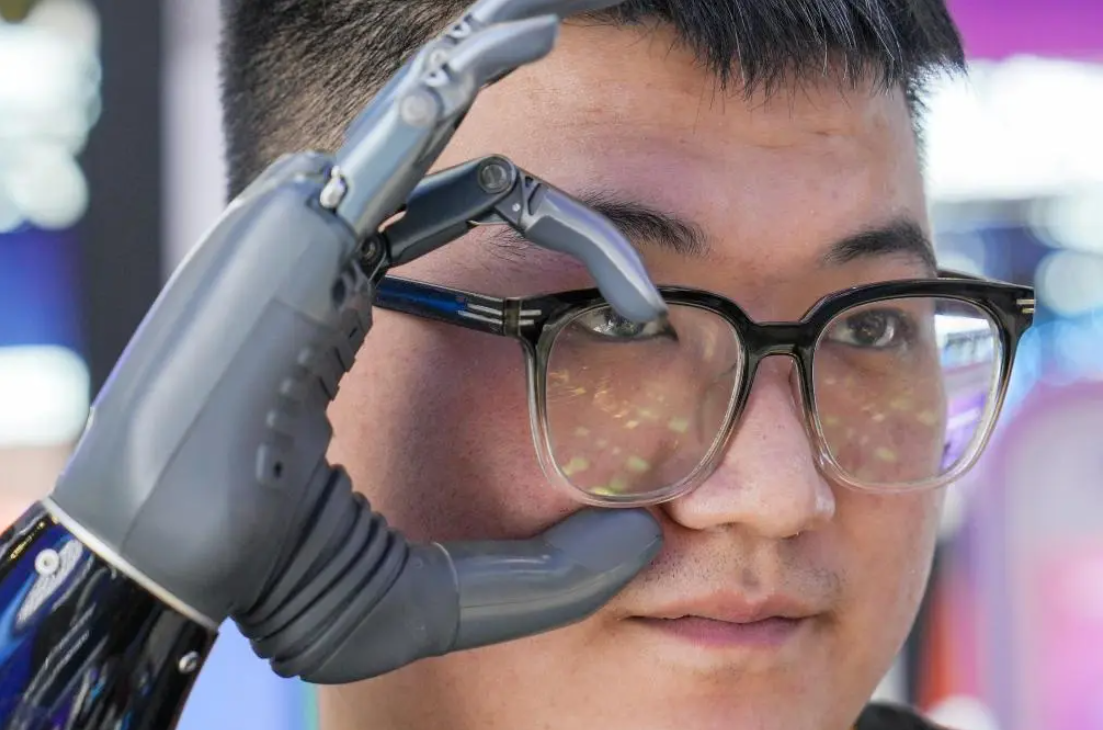 图片2025年7月17日,在北京举行的第三届中国国际供应链促进博览会上,浙江强脑科技有限公司一名右手残疾的工作人员在佩戴了BrainCo智能仿生手后摘取眼镜。新华社记者 鞠焕宗 摄