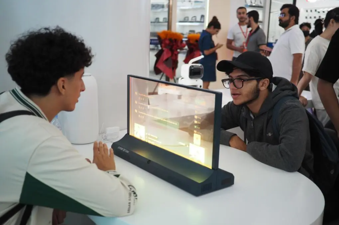 图片10月14日,两名外籍客商在义乌全球数贸中心体验AI翻译互动屏。新华社记者 刘梓漪 摄