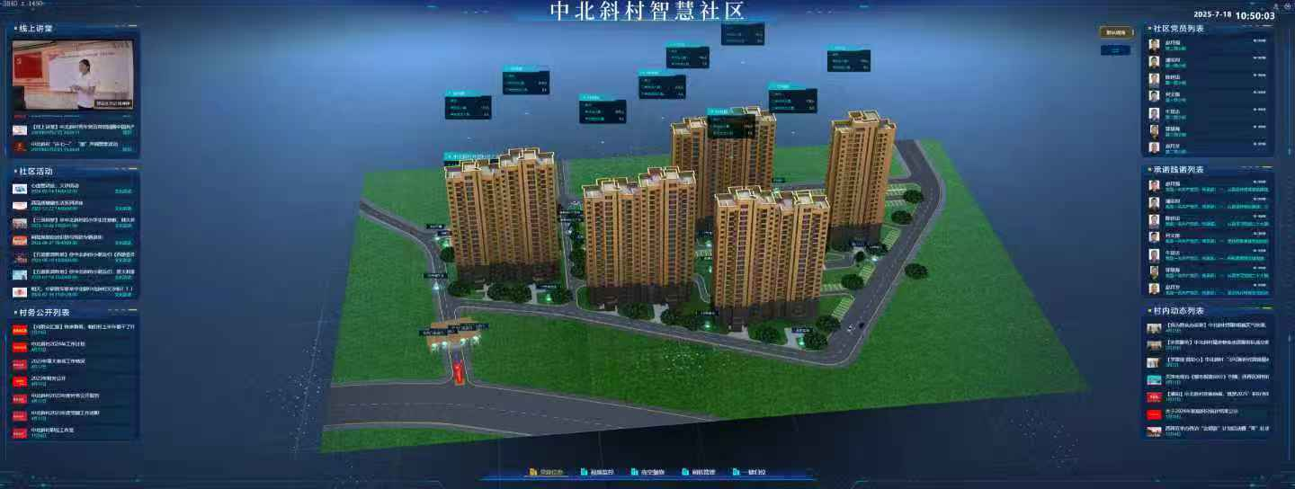 一是汇聚社区基础数据,支撑智慧应用场景。采集社区人口数据,分类管理和精细服务老年人、残疾人等重点人群;梳理党建数据,组织党员线上参与学习和社区活动,提升互动性;归集房屋数据,支撑搭建房屋出租等便民模块;汇聚政务服务数据,村民可线上预约代办物业、就业、民政等政务服务,不出小区解决“民生大事”。详实的基础数据搭配丰富的智慧场景,大大提升了中北斜村民的幸福感。二是整合社区动态感知数据,保障社区全方位安全。借助智慧门禁、高空坠物检测、小区全领域监控等多项系统资源,用数字化手段实现人过留影、车过留牌、卡过留痕,实时掌握社区信息,极大提升社区安全。依托AI技术,赋能工业园视频监控、各类传感器智能感知,推动温湿度监控、空气质量传感器、烟雾传感器等6项功能的智能巡查,保障园区安全发展。
