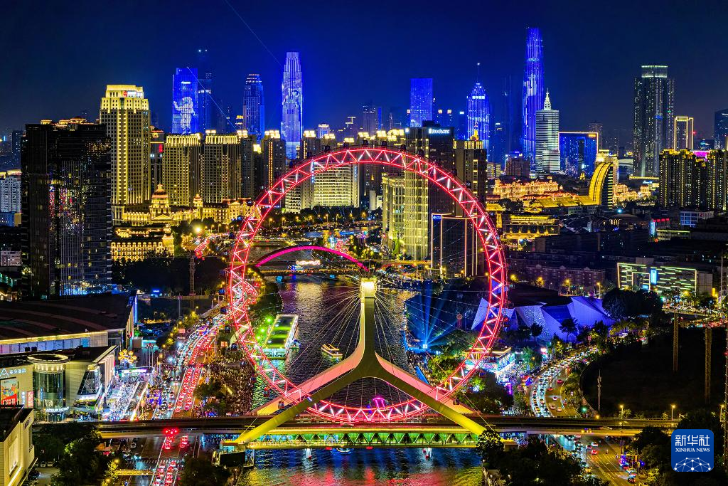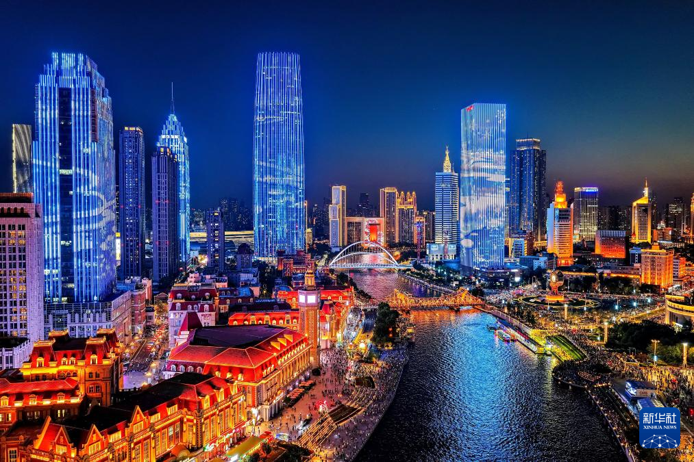 这是8月22日在天津站后广场拍摄的天津海河沿岸夜景(无人机照片)。