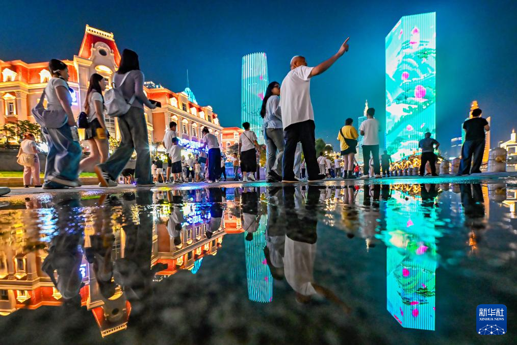8月25日晚,市民游客在天津海河岸边欣赏城市夜景。