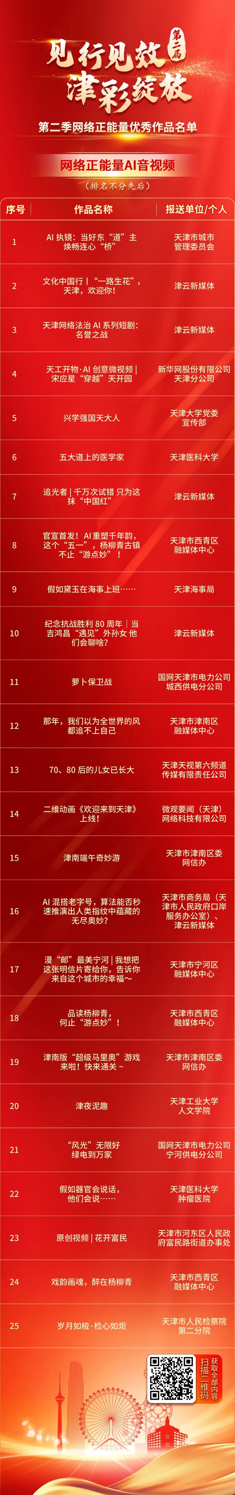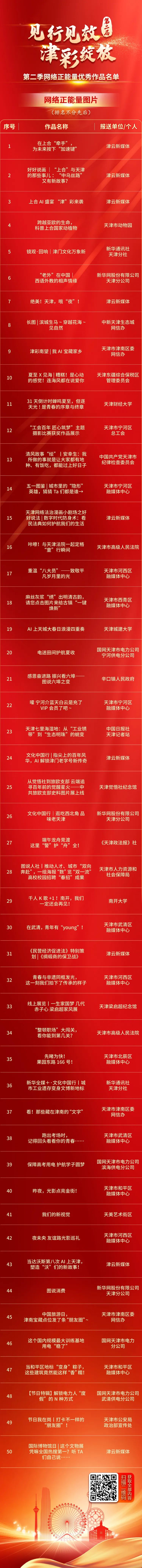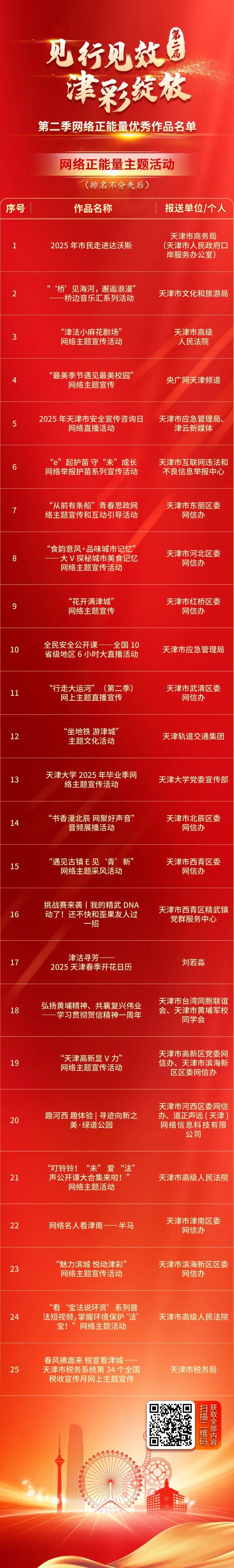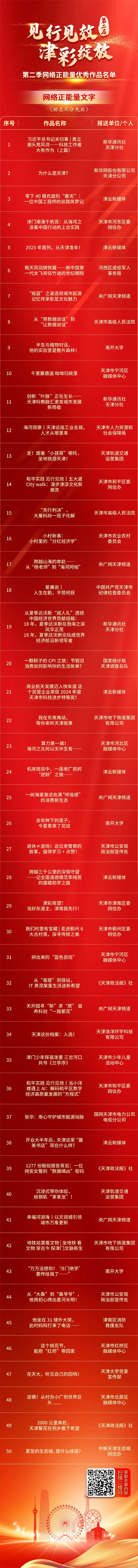 第二届“见行见效 津彩绽放”天津正能量网络精品征集展播活动自2025年1月1日启动以来各区各委办局各媒体广大网民积极参与累计征集网络正能量文字网络正能量图片网络正能量音视频(AI音视频)网络正能量专题专栏网络正能量主题活动各类作品近1.4万件